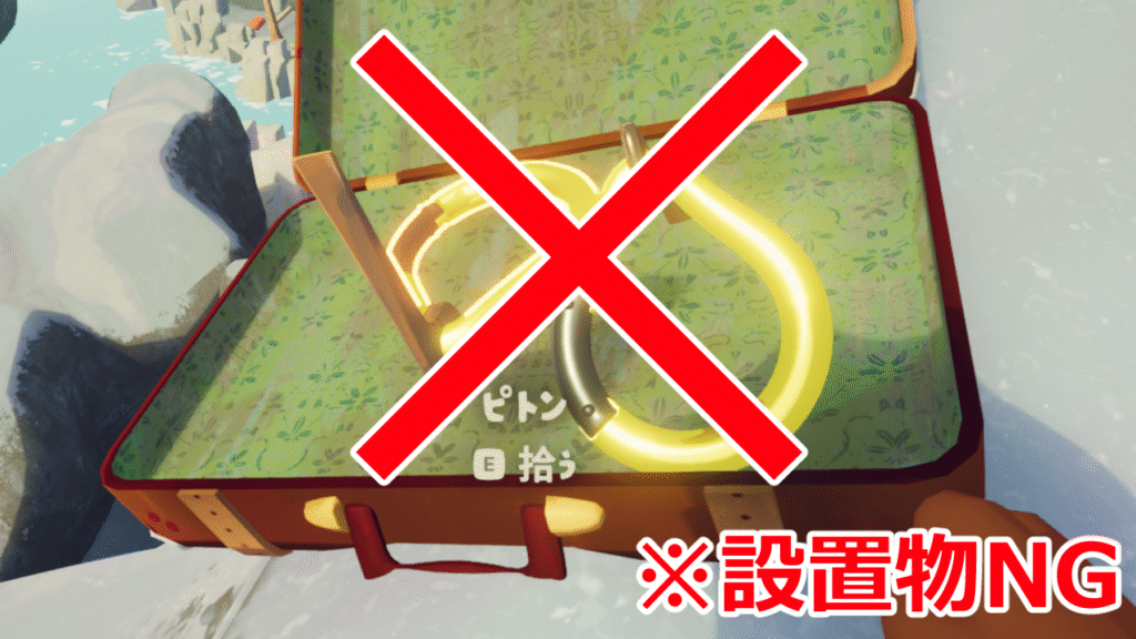 跡を濁さずバッジは、ロープやピトンなどの設置物を一切使わずに脱出すると獲得できます。アイテムを落とすなどの行為は実績に関わらないので、不要なアイテムは落としても問題ありません。