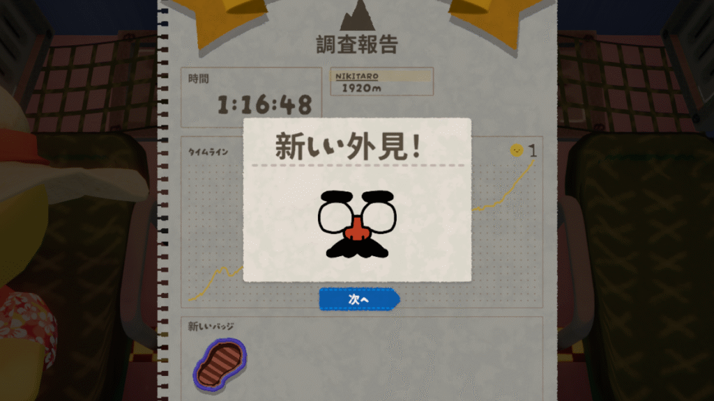 跡を濁さずバッジの実績を解除すると、鼻眼鏡の衣装が解放されます。おじさん風のキャラを作りたい時に活用できそうな衣装です。