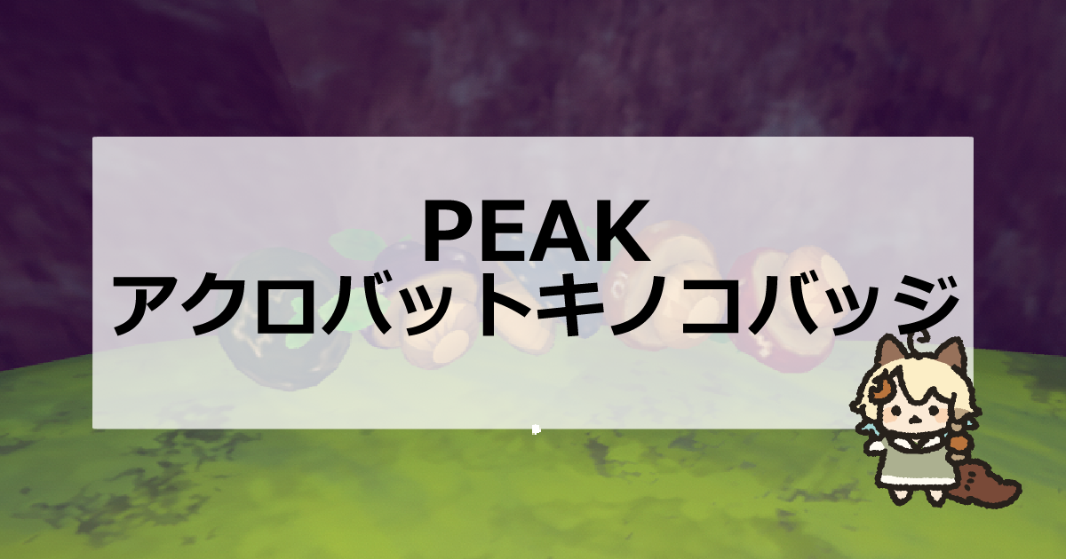 この記事ではPEAKのアクロバットキノコバッジについて解説しています。条件の「キノコで40メートルジャンプする」の達成方法と、報酬の衣装についてを掲載しているので、参考にしてください。