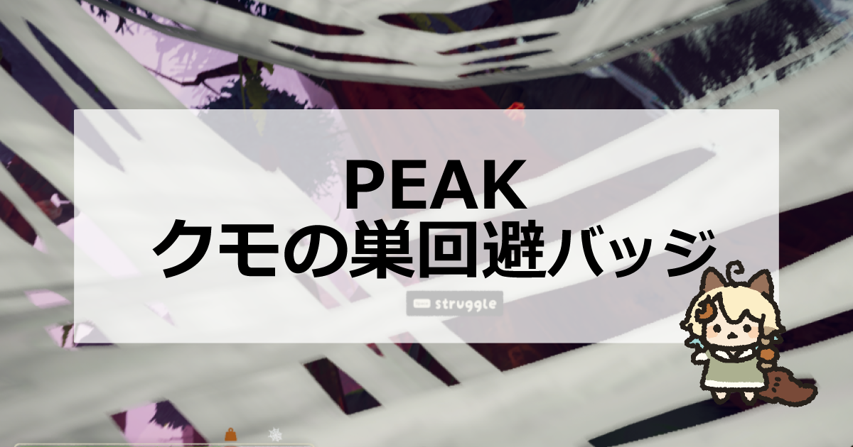この記事ではPEAKのクモの巣回避バッジについて解説しています。条件の「クモの巣をやり過ごす」の達成方法、報酬の衣装についてを掲載しているので、参考にしてください。
