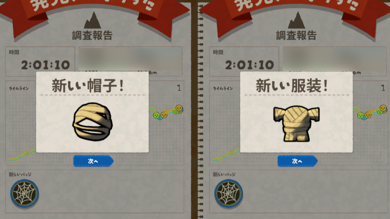 クモの巣回避バッジの実績を解除すると、帽子と服のミイラ衣装が解放されます。ハロウィンコーデを仲間にアピールしましょう。