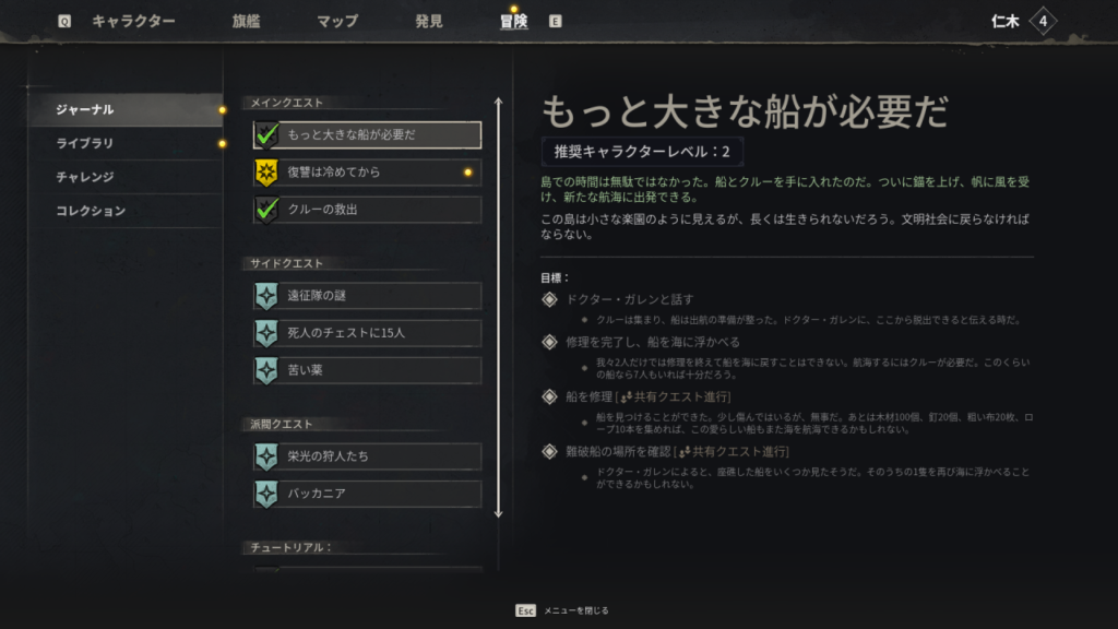 レベル上げに必要な経験値は、主にクエストをクリアすることで獲得できます特にメインクエストは、進めることで新しい船やクラフトレシピといった重要要素が次々と解放されます。キャラクターの育成と並行して、積極的に進行させていきましょう。