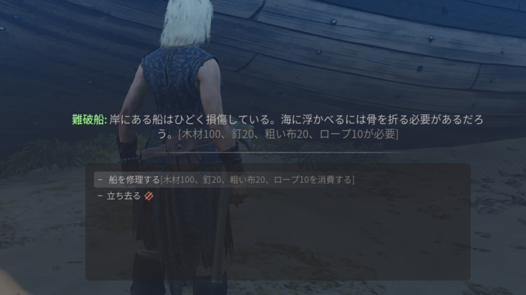 「クルーの救出」をクリアできたら、次は「もっと大きな船が必要だ」を進めましょう。3箇所あるクエストマーカーの内、一番北側にある場所が正解ですが、他の難破船も調べることでEXPを得られるため、道中で寄り道しながら向かうのがおすすめです。なお、船を修理する際に木材100個、釘20個、粗い布20枚、ロープ10本が必要になるので集めておくと良いでしょう。