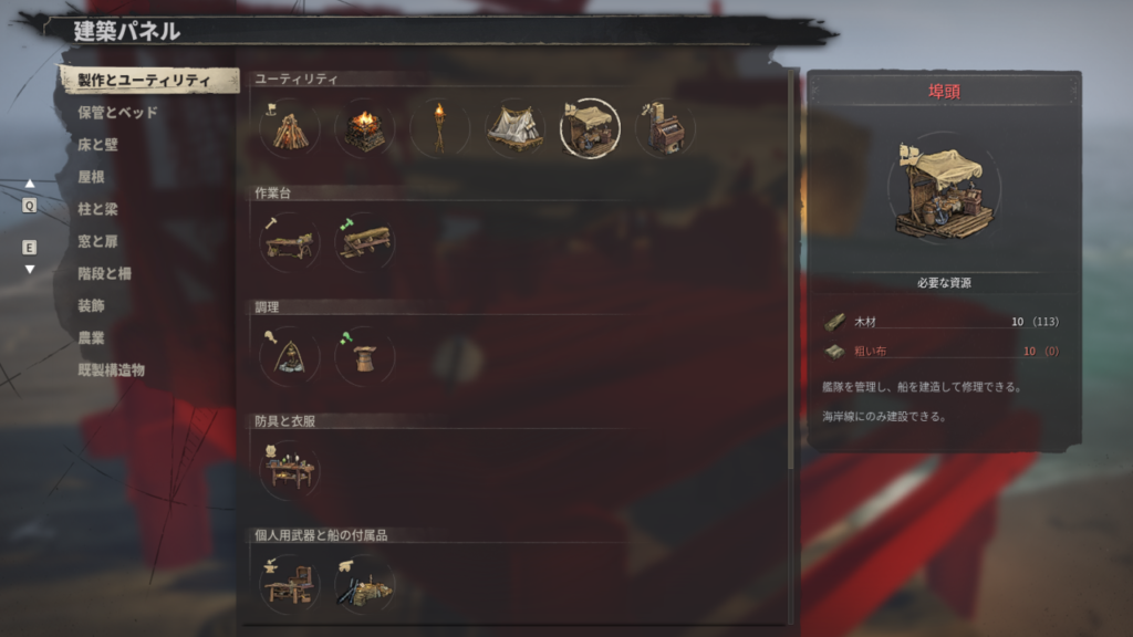 船大工の工房で作成した船装備は、建築で作れる「埠頭」で付け替えできます。船大工の工房で船装備を作っただけでは実装できないので、忘れずに埠頭でカスタマイズしましょう。なお、埠頭の建築レシピは、「船大工の工房」で「12ポンド砲」を作成すると入手できます。