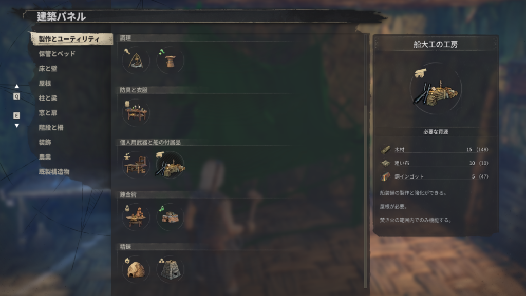 ケッチ船を入手後に作れるようになる建築「船大工の工房」では、船装備の製作と強化が可能です。特に、敵船との戦闘を行いたい場合は、12ポンド砲は優先して作成しましょう。